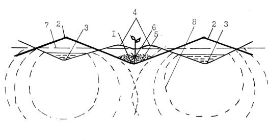 Промывку от солей на наклонных орошаемых землях проводят по бороздам. При этом почва между гребнями в дне борозд хорошо промывается от солей. После промывки и поспевания почвы в борозды вносится навоз (8-12 т/га), затем на месте бывших борозд формируются новые гребни с двумя вершинами. Одновременно с их формированием высевают хлопчатник по центру гребня между вершинами (рис.1). Высота гребней изменяется в пределах 14-16 см от верхней границы пахотного слоя. При посеве катки посевного агрегата удобно и быстро проходят между двумя вершинами, отпадает нужда в срезании вершин.